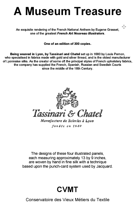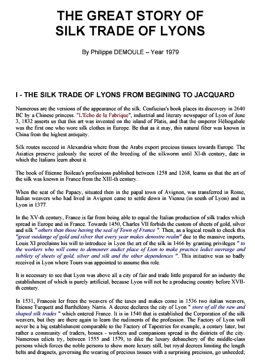 Demoule, Philippe. The Great Story of Silk Trade of Lyons, 12 pages. Posted June 19, 2002. FIRST PAGE. File size 169 KB PDF