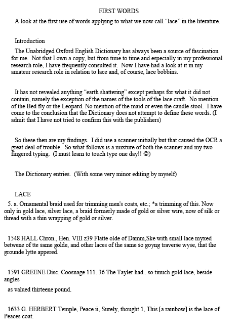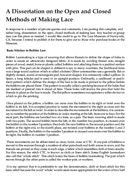 Merritt, Elaine. A Dissertation on the Open and Closed Methods of Making Lace, 3 pages. Note: By permission of the author. Posted March 25, 2005. FIRST PAGE. File size 38 KB PDF