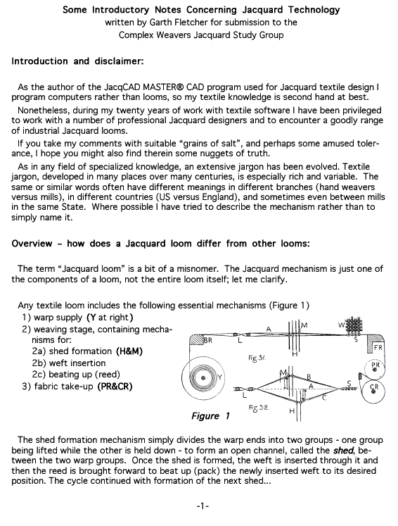 Fletcher, Garth. Some Introductory Notes Concerning Jacquard Technology, 13 pages. Note: By permission of the author. Posted January 18, 2005. FIRST PAGE. File size 1.6 MB PDF