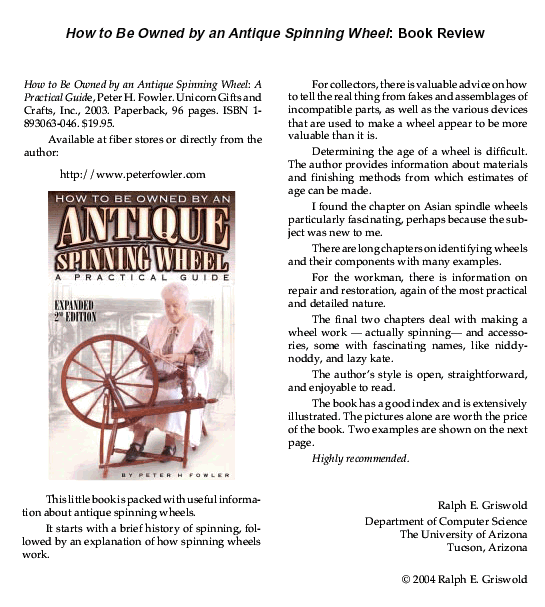 Griswold, Ralph E. How to Be Owned by an Antique Spinning Wheel: Book review, 2 pages. Posted April 17, 2004. FIRST PAGE. File size 488 KB PDF