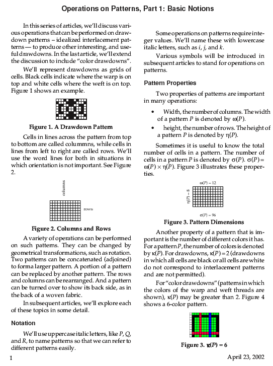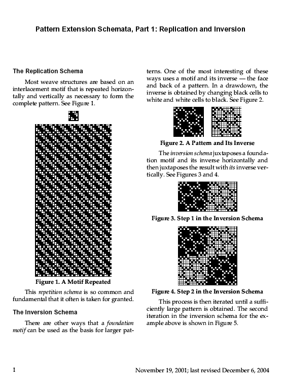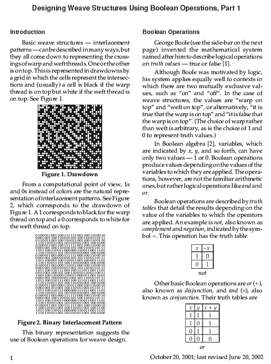 Griswold, Ralph E. Designing Weave Structures Using Boolean Operations, Part 1, 5 pages. Note: Revised June 20, 2002. Posted November 11, 2001. FIRST PAGE. File size 463 KB PDF