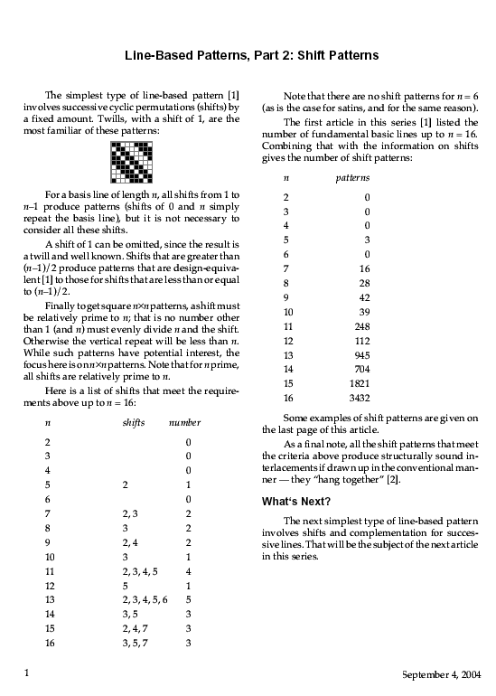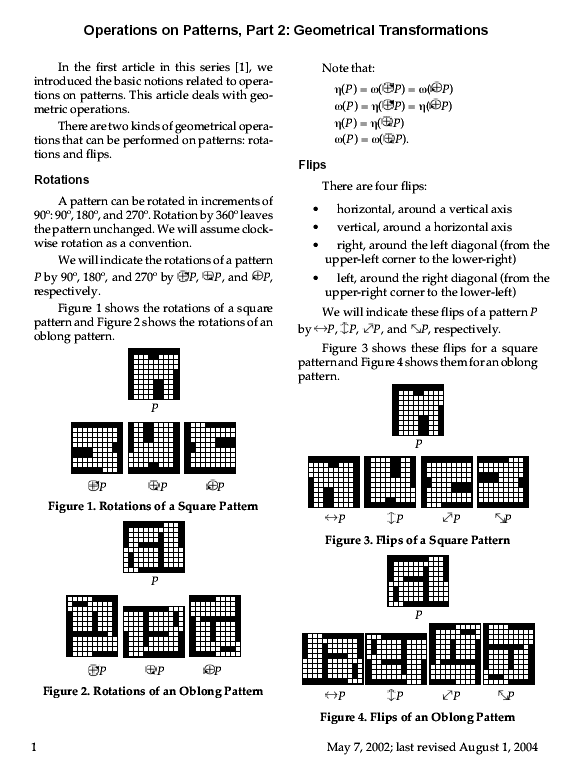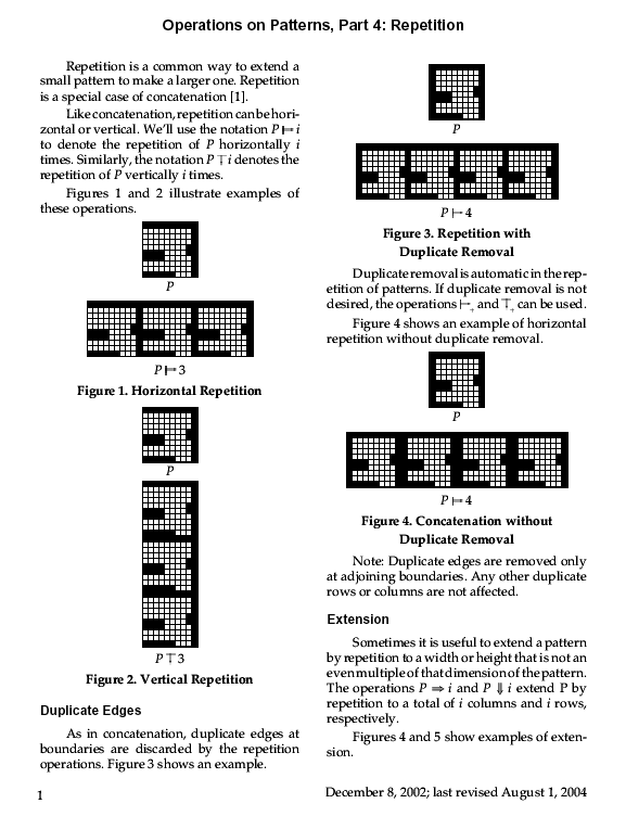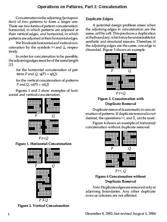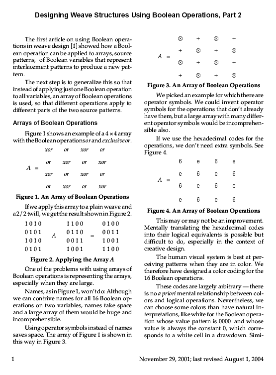 Griswold, Ralph E. Designing Weave Structures Using Boolean Operations, Part 2, 3 pages. Note: Last revised August 1, 2004. Posted August 4, 2004. FIRST PAGE. File size 512 KB PDF