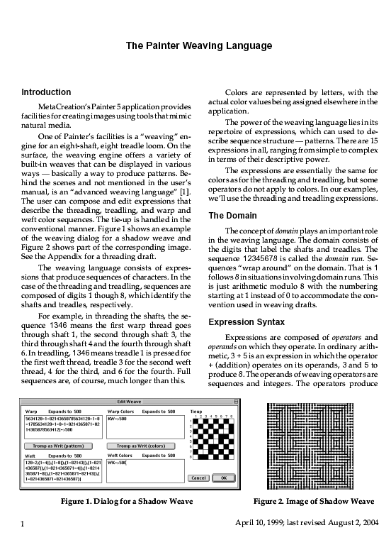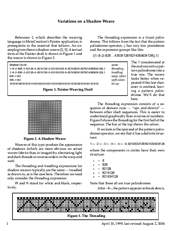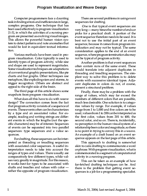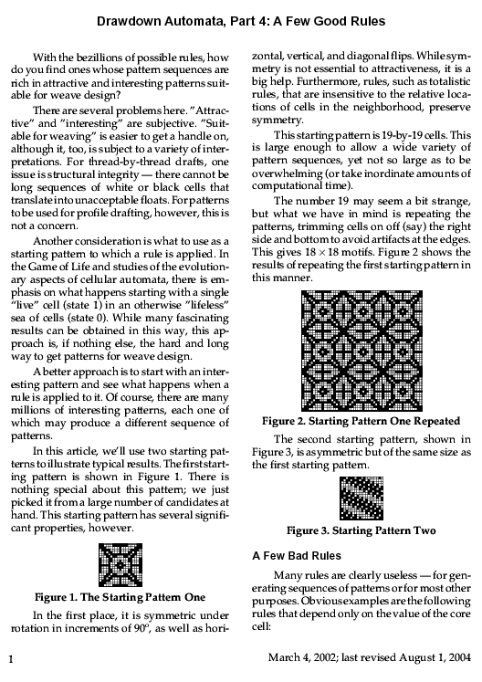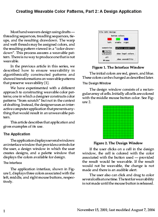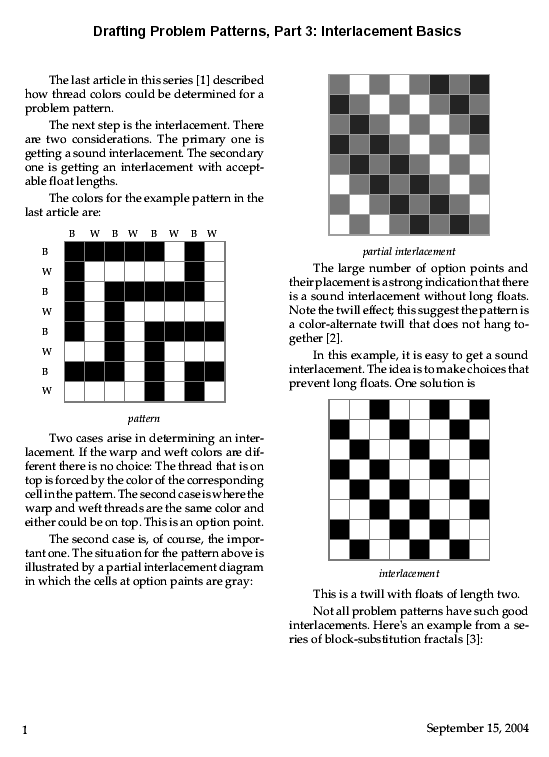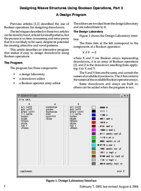 Griswold, Ralph E. Designing Weave Structures Using Boolean Operations, Part 3: A Design Program, 6 pages. Note: Last revised August 4, 2004. Posted August 4, 2004. FIRST PAGE. File size 536 KB PDF