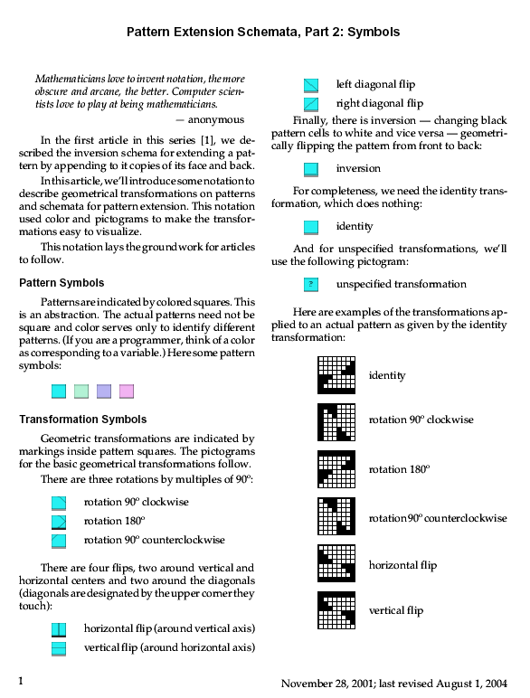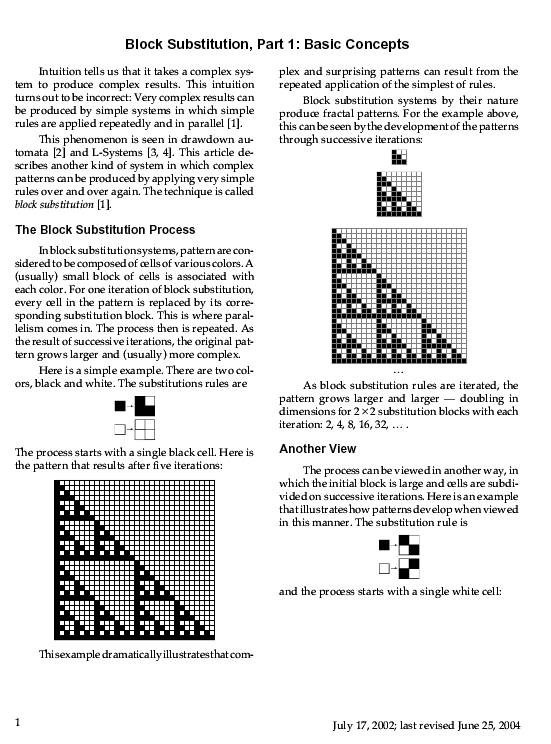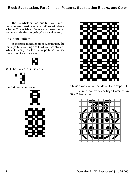 Griswold, Ralph E. Block Substitution, Part 2: Initial Patterns.Substitution Blocks. and Color, 4 pages. Note: Last revised June 24, 2004. Posted June 25, 2004. FIRST PAGE. File size 500 KB PDF