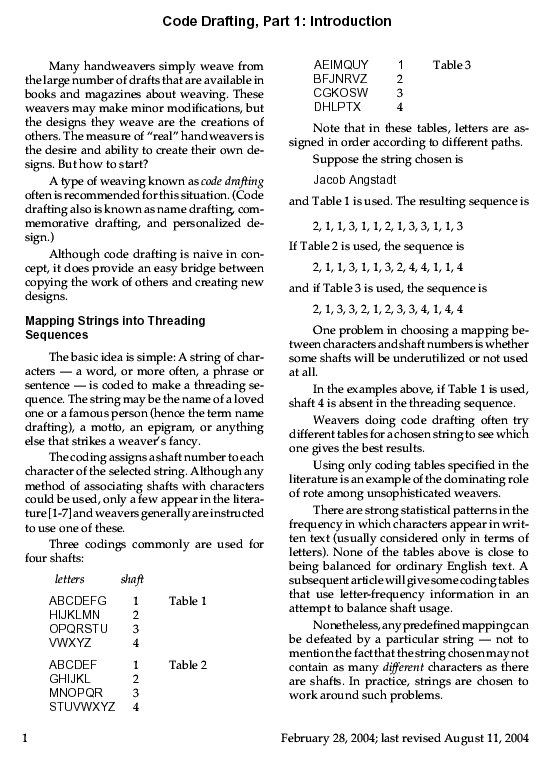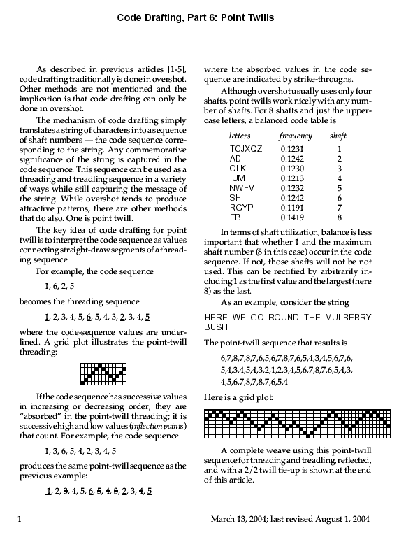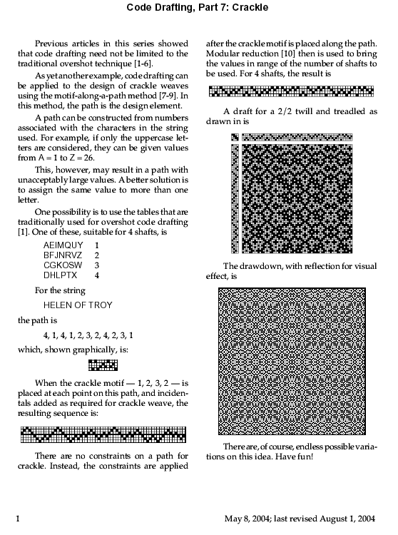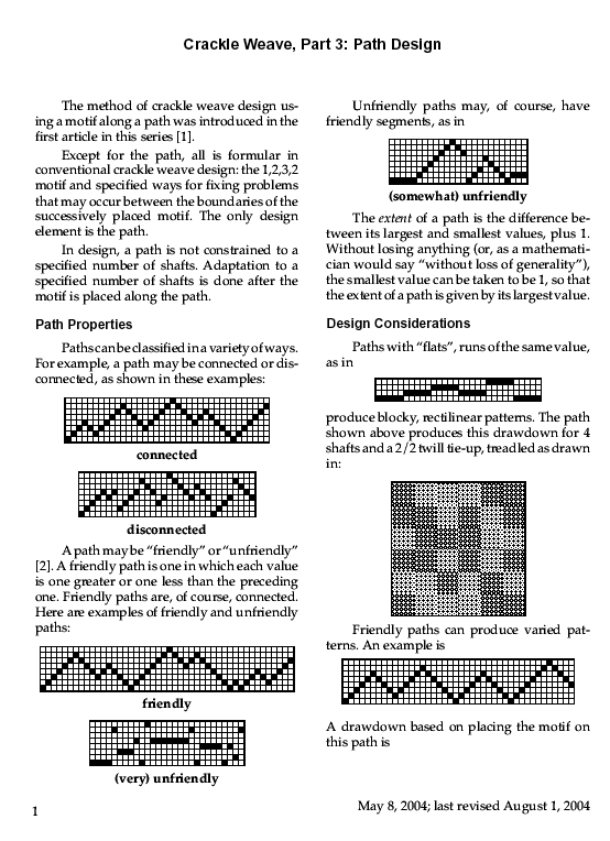 Griswold, Ralph E. Crackle Weave, Part 3: Path Design, 3 pages. Note: Last revised August 1, 2004. Posted August 7, 2004. FIRST PAGE. File size 456 KB PDF