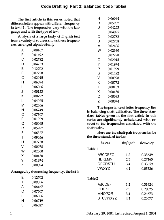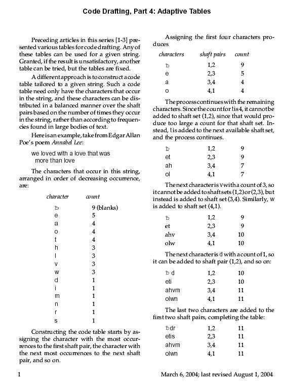 Griswold, Ralph E. Code Drafting: Part 2 -- Balanced Code Tables, 2 pages. Note: Last revised August 1, 2004. Posted August 7, 2004. FIRST PAGE. File size 40 KB PDF