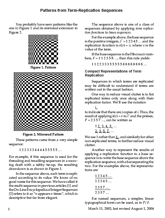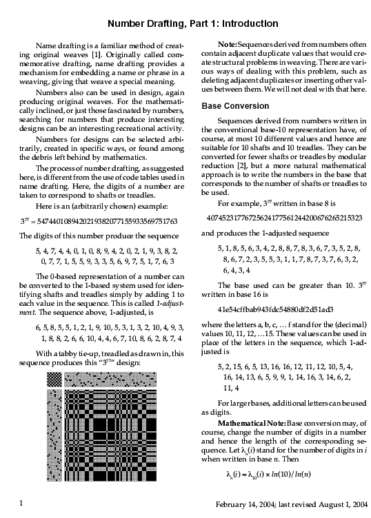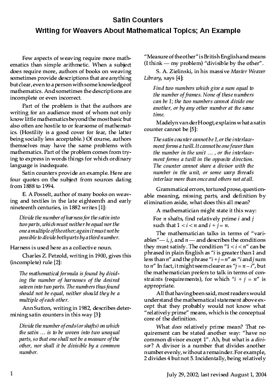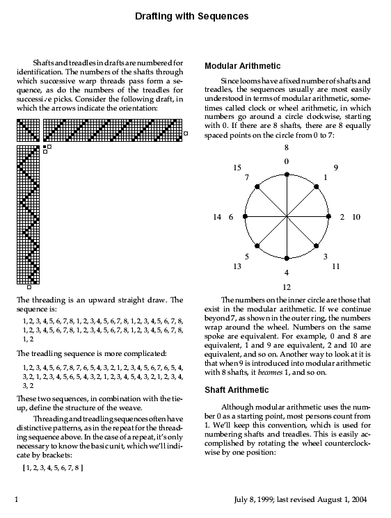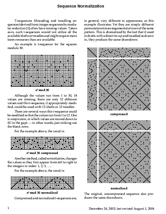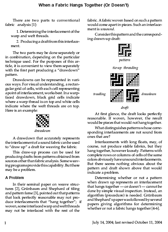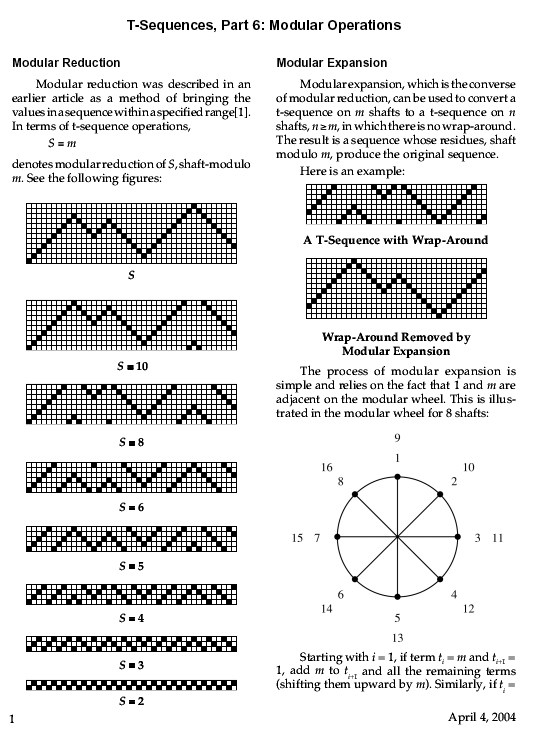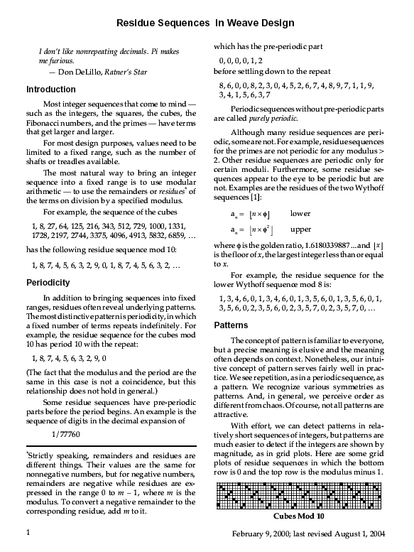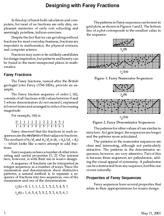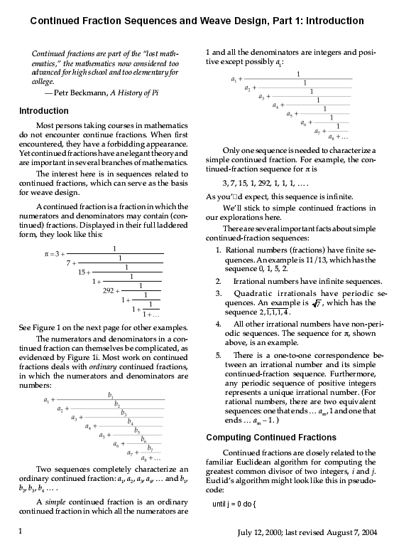 Griswold, Ralph E. Continued Fractions in Weave Design -- I, 5 pages. Note: Last revised August 7, 2004. Posted August 7, 2004. FIRST PAGE. File size 504 KB PDF