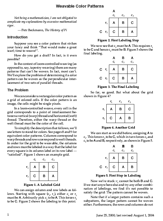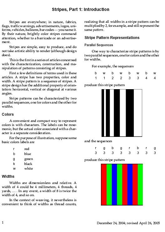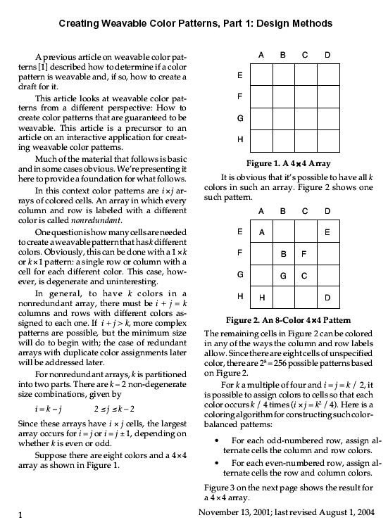Griswold, Ralph E. Creating Weaveable Color Patterns, Part 1, 3 pages. Note: Last revised August 1, 2004. Posted August 7, 2004. FIRST PAGE. File size 512 KB PDF