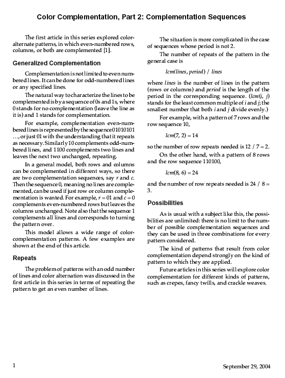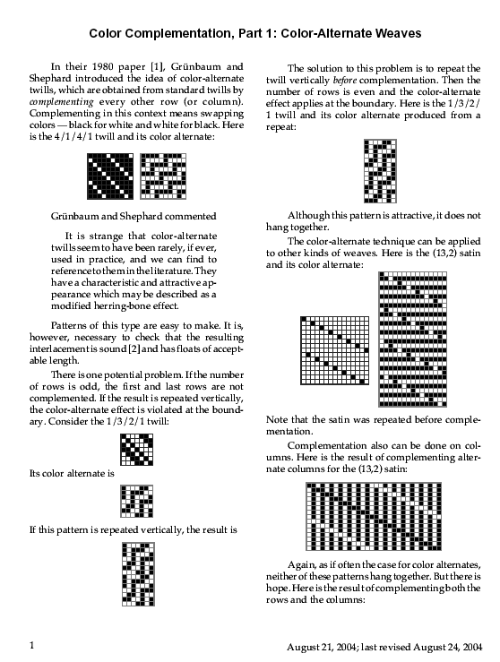 Griswold, Ralph E. Color Complementation, Part 1: Color-Alternate Weaves, 6 pages. Note: Last revised August 25, 2004. Posted August 25, 2004. FIRST PAGE. File size 464 KB PDF