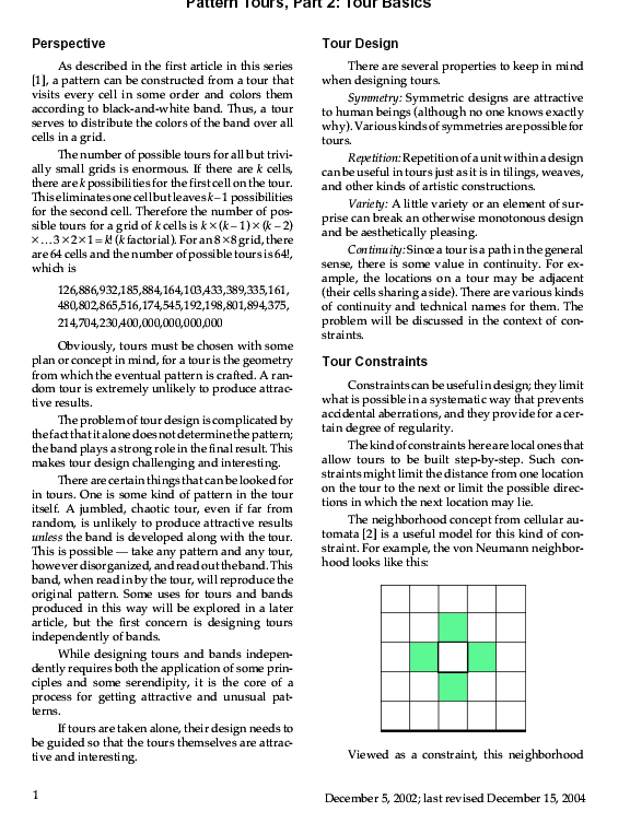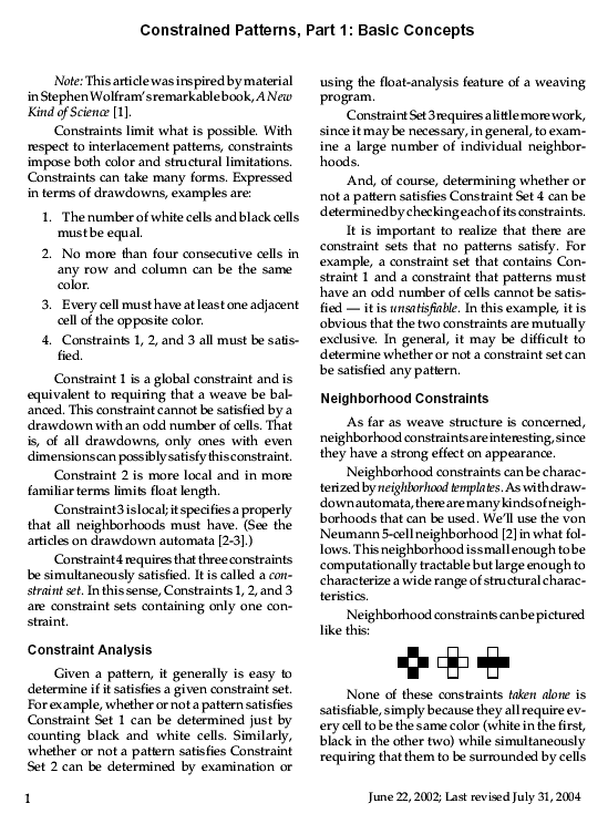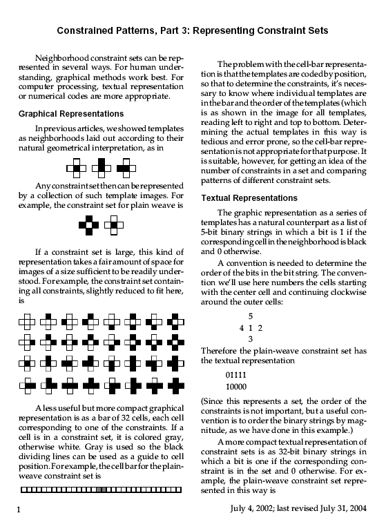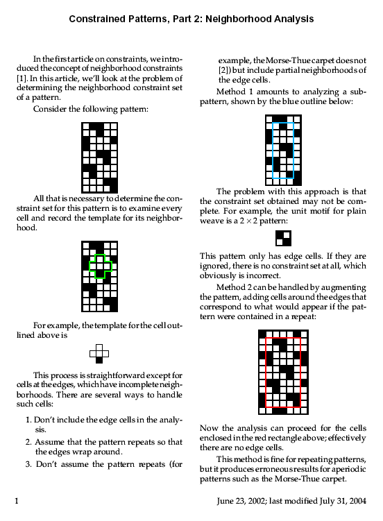 Griswold, Ralph E. Constrained Patterns, Part 2: Neighborhood Analysis, 2 pages. Note: Last revised July 31, 2004. Posted August 3, 2004. FIRST PAGE. File size 432KB PDF