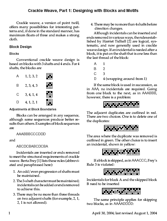 Griswold, Ralph E. Crackle Weave, Part 1: Designing with Blocks and Motifs, 3 pages. Note: Last revised August 1, 2004. Posted August 7, 2004. FIRST PAGE. File size 460 KB PDF