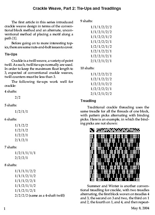 Griswold, Ralph E. Crackle Weave, Part 2: Tie-Ups and Treadlings, 2 pages. Posted May 8, 2004. FIRST PAGE. File size 436 KB PDF