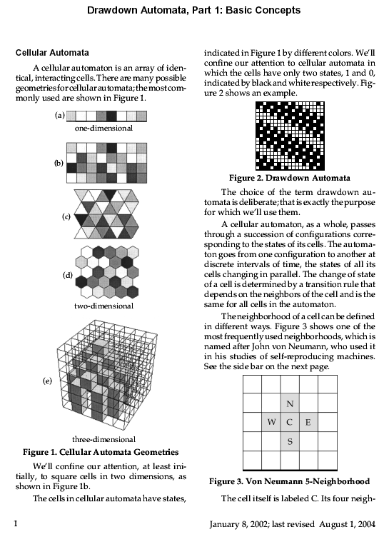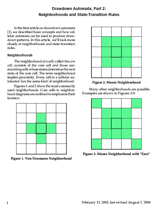 Griswold, Ralph E. Drawdown Automata, Part 2: Neighborhoods and State-Transition Rules, 6 pages. Note: Last revised August 1, 2004. Posted August 7, 2004. FIRST PAGE. File size 504 KB PDF