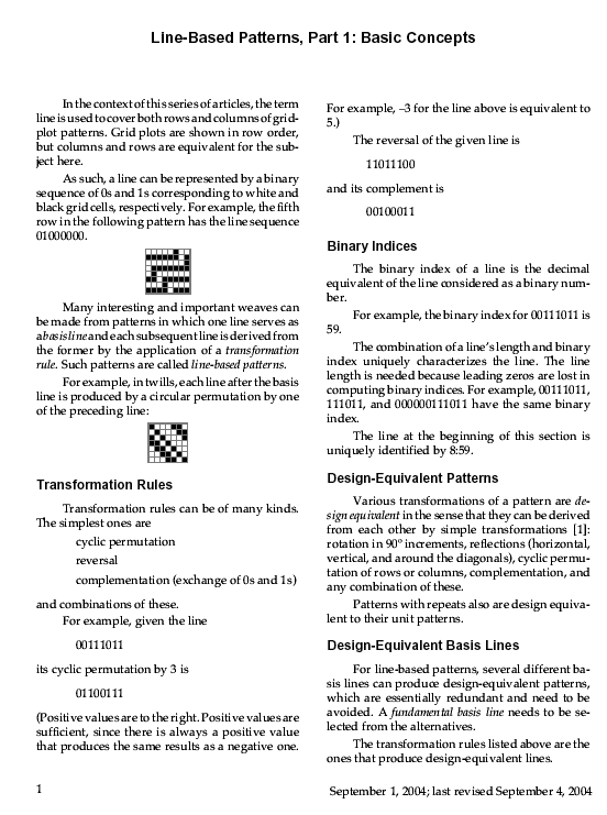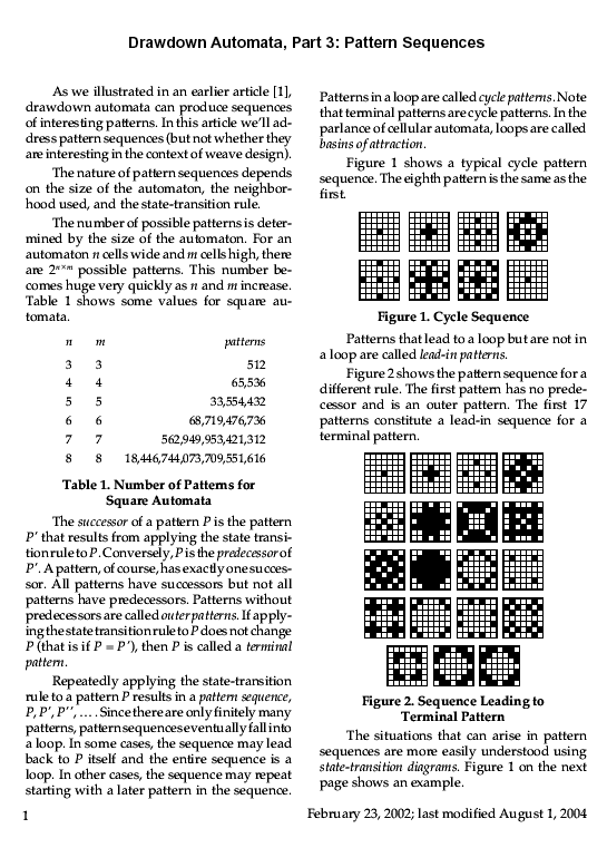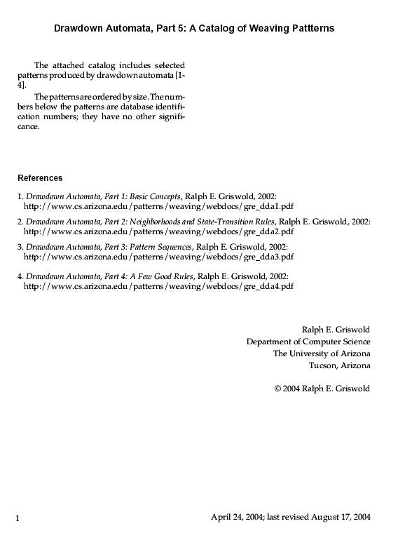 Griswold, Ralph E. Drawdown Automata, Part 5: A Catalog of Weaving Patterns, 144 pages. Note: Last revised August 17, 2004. Posted August 20, 2004. FIRST PAGE. File size 36 KB PDF