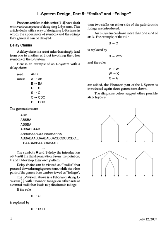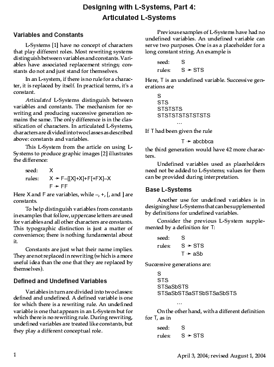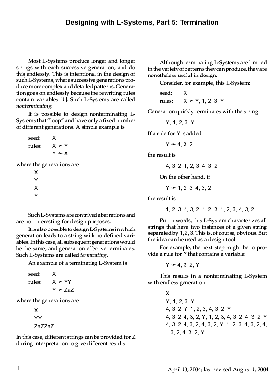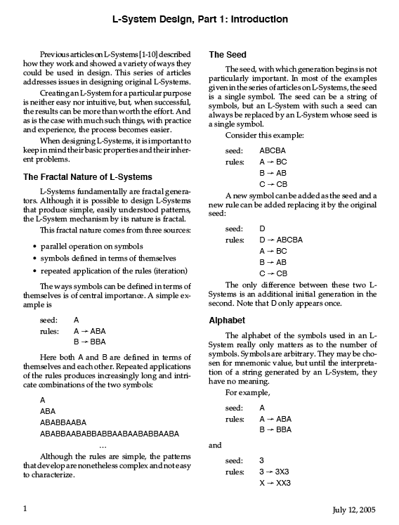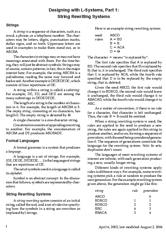Griswold, Ralph E. Designing with L-Systems, Part 1: String Rewriting Systems, 5 pages. Note: Last revised August 2, 2004. Posted August 11, 2004. FIRST PAGE. File size 560 KB PDF