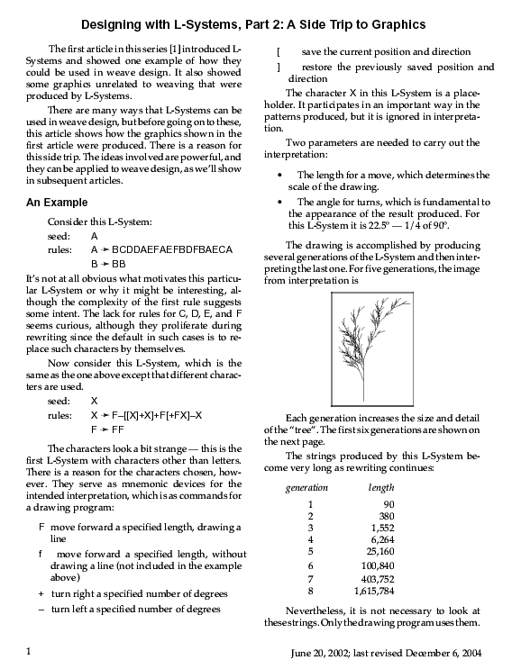 Griswold, Ralph E. Designing with L-Systems, Part 2: A Side Trip to Graphics, 2 pages. Note: Last revised December 15, 2004. Posted December 15, 2004. FIRST PAGE. File size 444 KB PDF