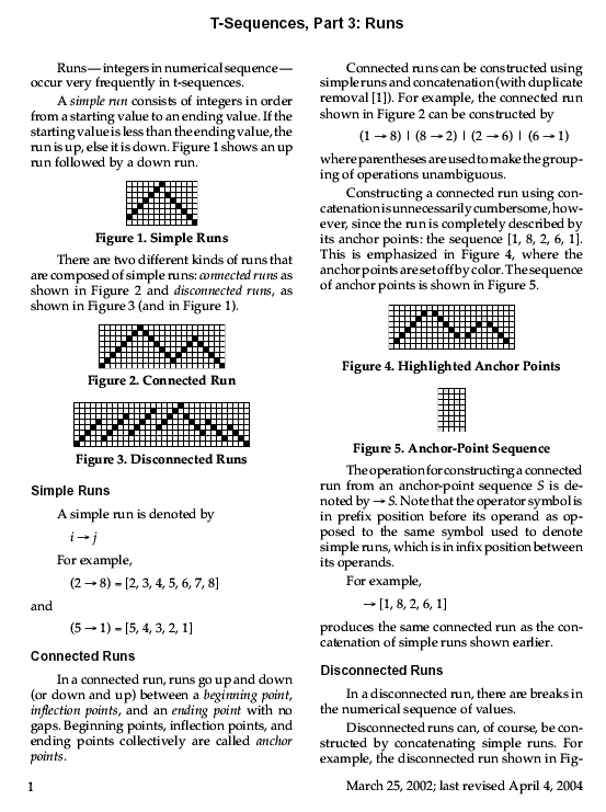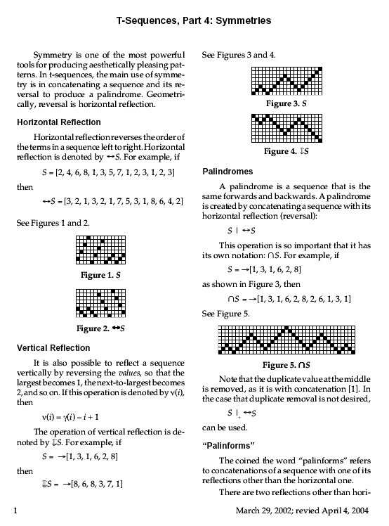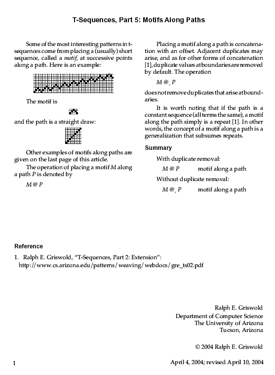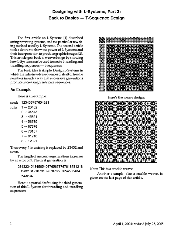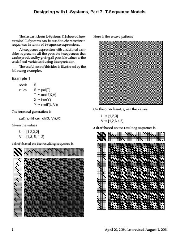 Griswold, Ralph E. Designing with L-Systems, Part 3: Back to Basics -- T-Sequence Design, 3 pages. Note: Last revised July 25, 2005. Posted July 25, 2005. FIRST PAGE. File size 456 KB PDF