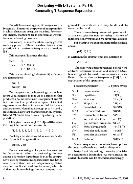 Griswold, Ralph E. Designing with L-Systems, Part 6: Generating T-Sequence Expressions, 2 pages. Note: Last revised November 25, 2004. Posted December 1, 2004. FIRST PAGE. File size 436 KB PDF