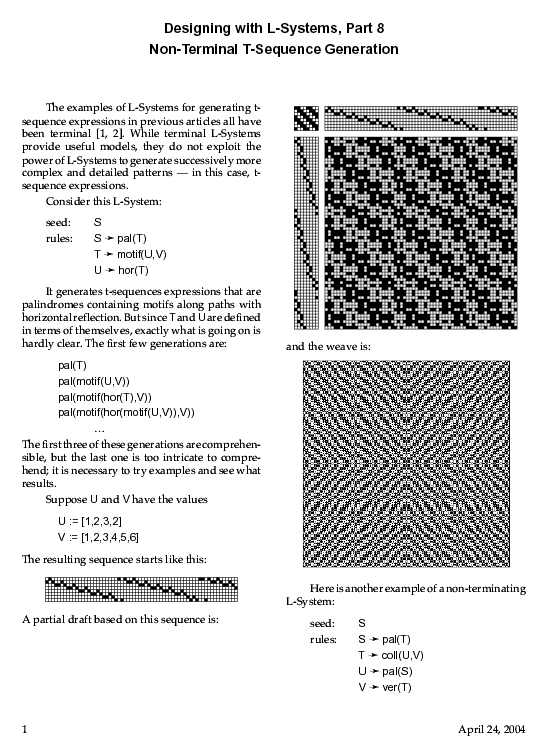 Griswold, Ralph E. Designing with L-Systems, Part 8: Non-Terminal T-Sequnece Generation, 3 pages. Posted April 24, 2004. FIRST PAGE. File size 452 KB PDF