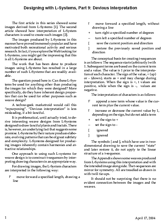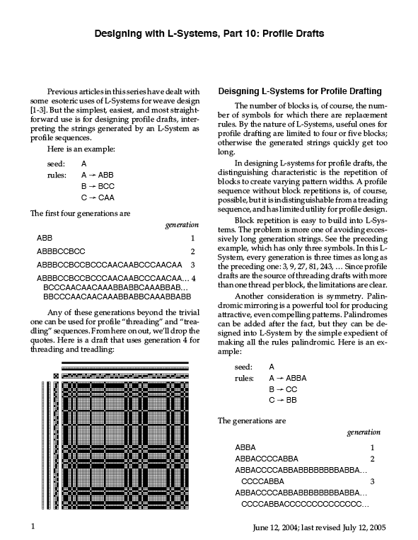 Griswold, Ralph E. Designing with L-Systems, Part 10: Profile Drafts, 2 pages. Note: Last revised July 12, 2005. Posted July 24, 2005. FIRST PAGE. File size 448 KB PDF