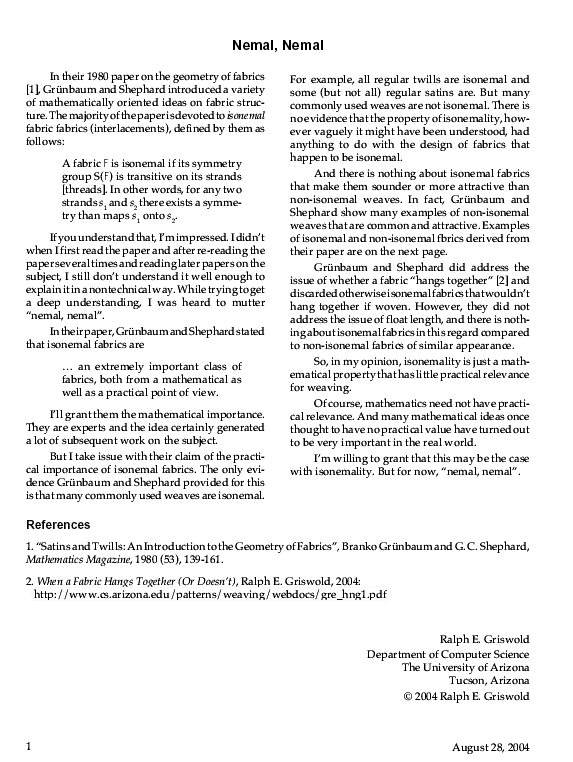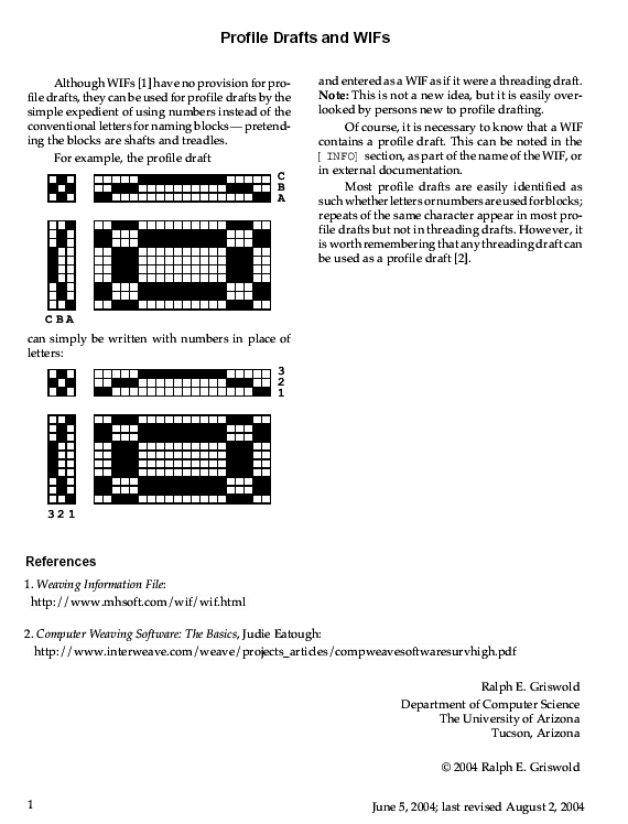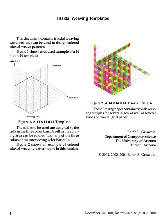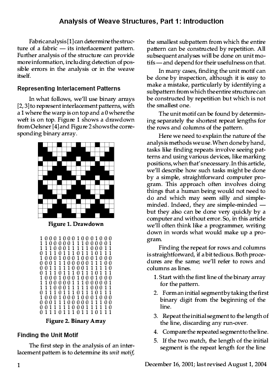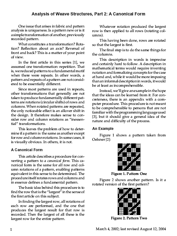 Griswold, Ralph E. Analysis of Weave Structures, Part 2: A Canonical Form, 4 pages. Note: Last modified August 12, 2004. Posted August 20, 2004. FIRST PAGE. File size 444 KB PDF