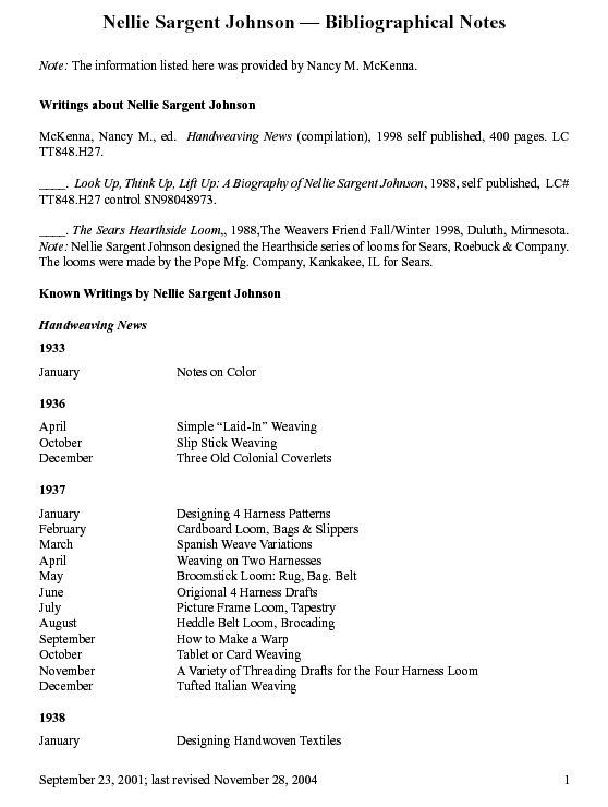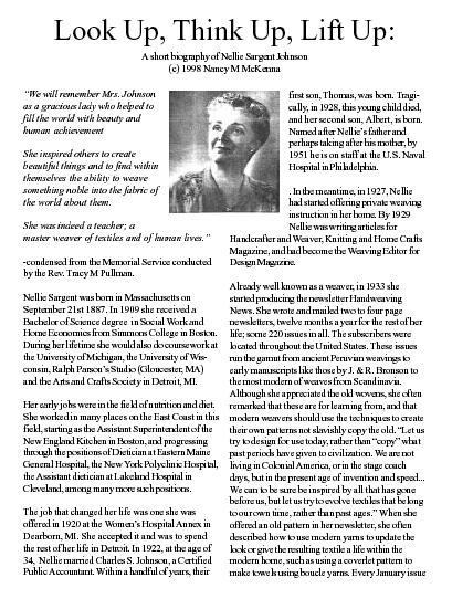 McKenna, Nancy M. Look Up, Think Up, Lift Up: A Short Biography of Nellie Sargent Johnson, 4 pages. Posted December 25, 2001. FIRST PAGE. File size 24 KB PDF