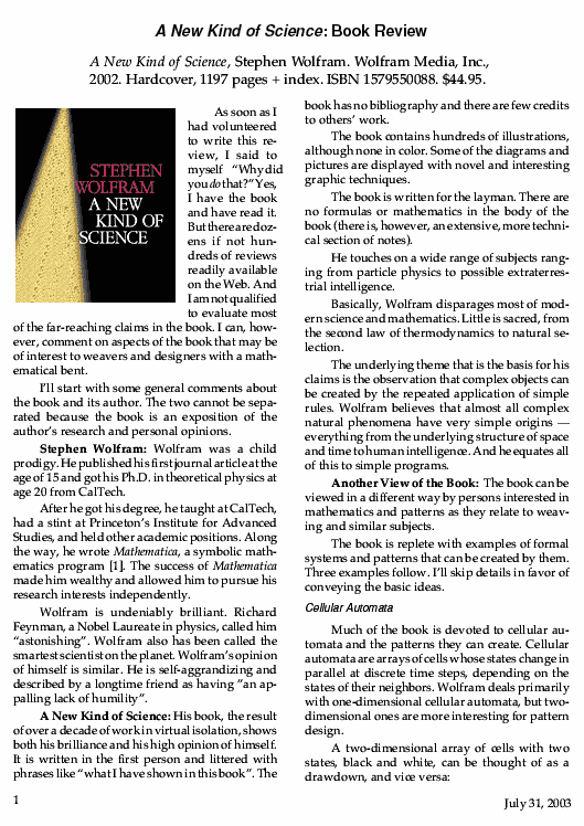 Griswold, Ralph E. A New Kind of Science: Book Review, 3 pages. Posted August 1, 2003. FIRST PAGE. File size 472 KB PDF