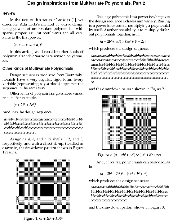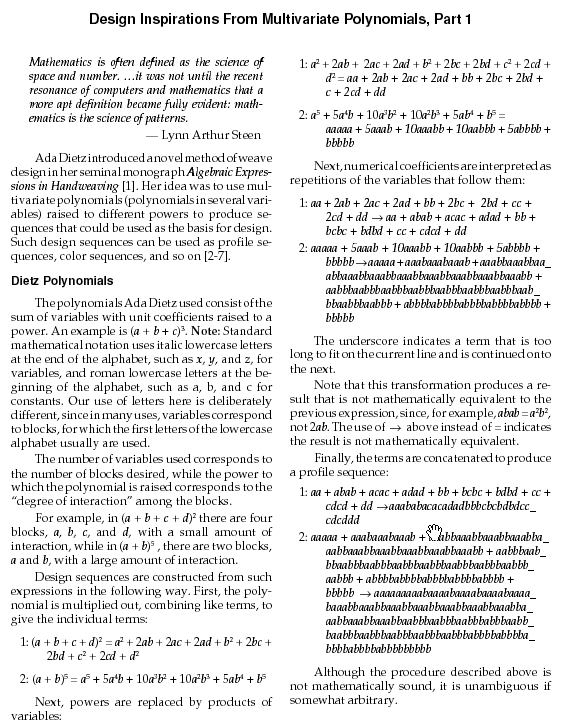 Griswold, Ralph E. Design Inspirations from Multivariate Polynomials, Part 1, 7 pages. Posted September 13, 2001. FIRST PAGE. File size 434 KB PDF