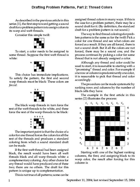 Griswold, Ralph E. Drafting Problem Patterns, Part 2: Thread Colors, 3 pages. Note: Last revised September 15, 2004. Posted September 15, 2004. FIRST PAGE. File size 440 KB PDF
