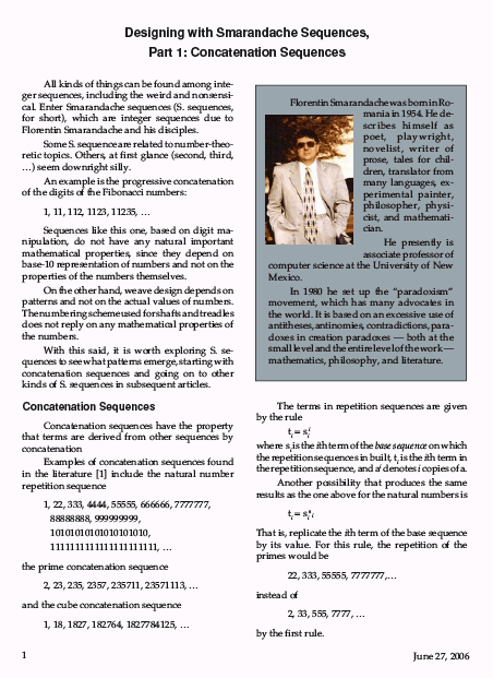 Griswold, Ralph E. Designing with Smarandache Sequences, Part 1: Concatenation Sequences, 3 pages. Posted July 9, 2006. FIRST PAGE. File size 56 KB PDF