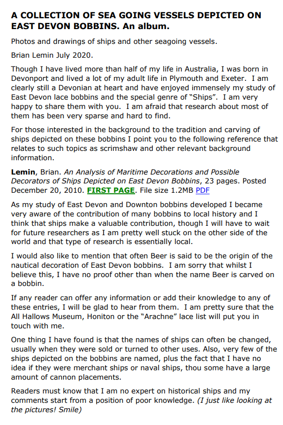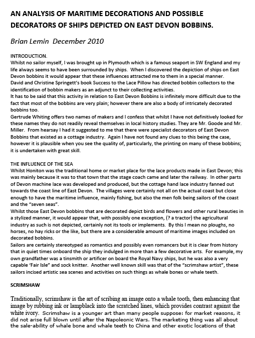 Lemin, Brian. An Analysis of Maritime Decorations and Possible Decorators of Ships Depicted on East Devon Bobbins , 23 pages. Posted December 20, 2010. FIRST PAGE. File size 1.2MB PDF