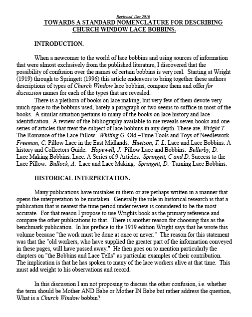 Lemin, Brian. What to Look for on Your Decorated Honiton Bobbins?, 7 pages. Posted October 27, 2019. FIRST PAGE. File size 830 KB PDF