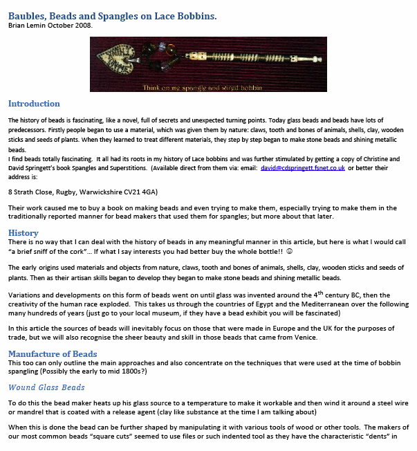 Lemin, Brian. Baubles Beads and Spangles on Lace Bobbins, 1 page. Posted December 20, 2010. FIRST PAGE. File size 576KB PDF