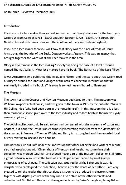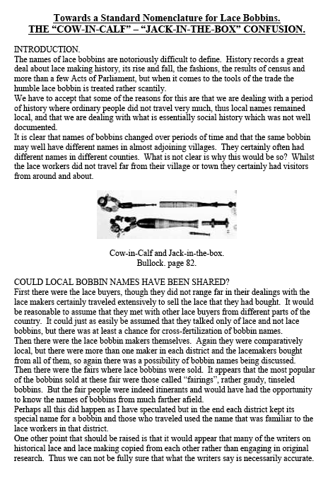 Lemin, Brian. The Unique Names of Lace Bobbins used in the Olney Museum, 3 pages. Posted December 20, 2010. FIRST PAGE. File size 352KB PDF
