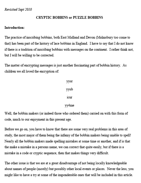 Lemin, Brian. Cryptic Bobbins or Puzzle Bobbins, 11 pages. Posted December 20, 2010. FIRST PAGE. File size 224KB PDF