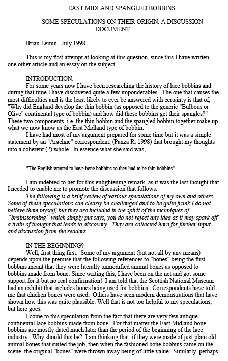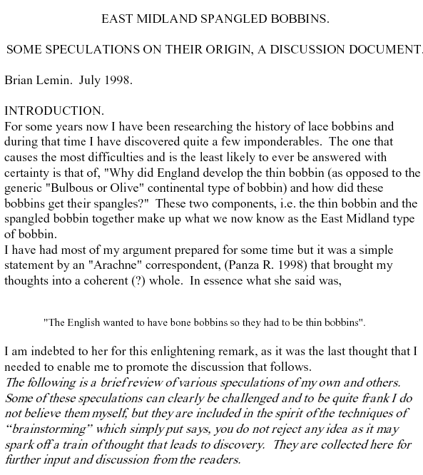 Lemin, Brian. East Midland Spangled Bobbins some Speculations, 10 pages. Posted December 20, 2010. FIRST PAGE. File size 192KB PDF