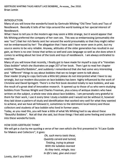 Lemin, Brian. Gertrude Whiting Talks About Lace Bobbins. An Essay, 3 pages. Posted December 20, 2010. FIRST PAGE. File size 320KB PDF