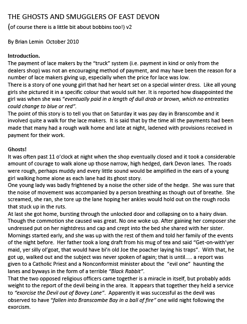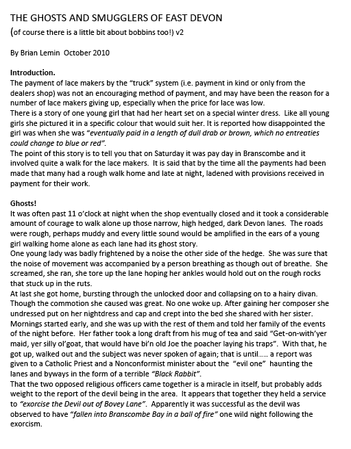 Lemin, Brian. Ghosts and Smugglers of East Devon v2, 3 pages. Posted December 20, 2010. FIRST PAGE. File size 352KB PDF