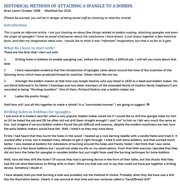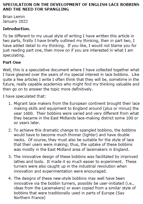 Lemin, Brian. Speculation on the Development of English Lace Bobbins and the Need for Spangling, 29 pages. Posted 7 March, 2022 FIRST PAGE. File size 2,402 KB PDF