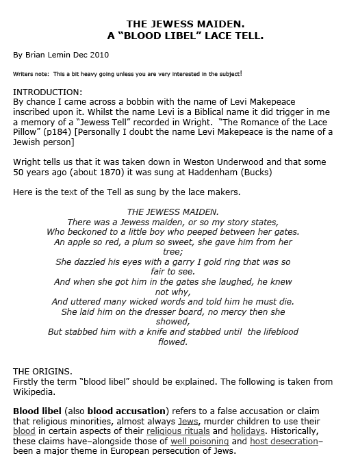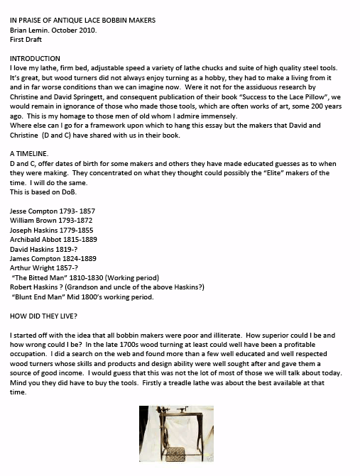 Lemin, Brian. In Praise of Antique Lace Bobbin Makers, 8 pages. Posted December 20, 2010. FIRST PAGE. File size 320KB PDF