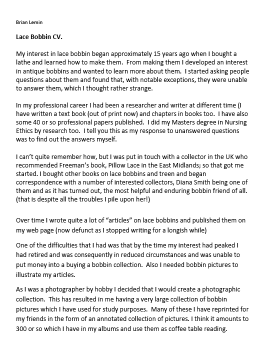 Lemin, Brian. Lace Bobbin CV, 4 pages. Posted December 20, 2010. FIRST PAGE. File size 224KB PDF
