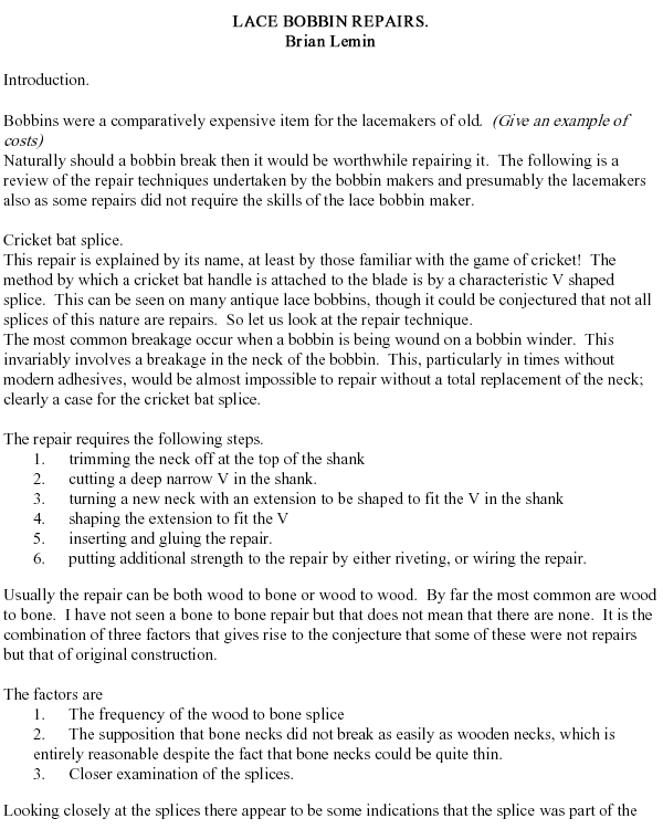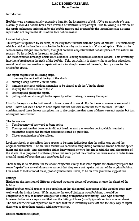 Lemin, Brian. Lace Bobbin Repairs, 4 pages. Posted June 10, 2003. FIRST PAGE. File size 20 KB PDF
