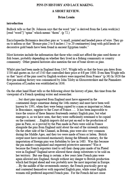 Lemin, Brian. Pins and Lacemaking, 9 pages. Posted December 20, 2010. FIRST PAGE. File size 128KB PDF