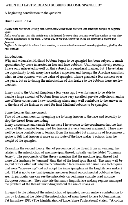 Lemin, Brian. When did East Midland Bobbins Become Spangled, 4 pages. Posted December 20, 2010. FIRST PAGE. File size 160KB PDF