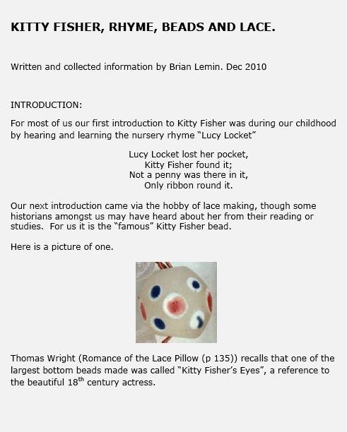 Lemin, Brian. Kitty Fisher. Rhyme, Beads and Lace, 8 pages. Posted December 22, 2010. FIRST PAGE. File size 256KB PDF