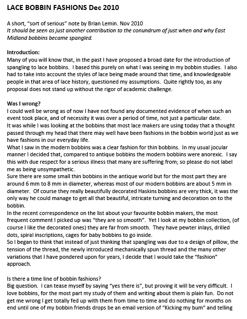 Lemin, Brian. Lace Bobbin Fashions, 6 pages. Posted December 28, 2010. FIRST PAGE. File size 864KB PDF