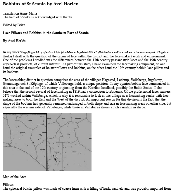 Lemin, Brian. Bobbins of St Scania by Axel Horlen, 8 pages. Note: transliteration of original work by Axel Horlen. Posted December 29, 2010. FIRST PAGE. File size 128KB PDF