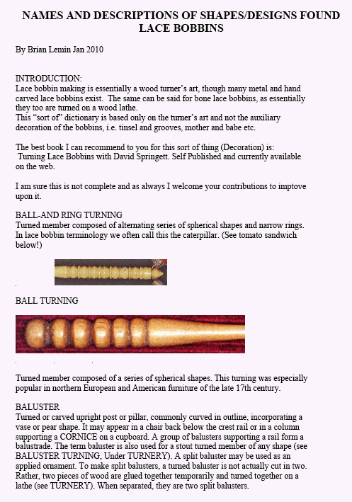 Lemin, Brian. Terms Used to Describe Lace Bobbins, 4 pages. Posted December 20, 2010. FIRST PAGE. File size 224KB PDF