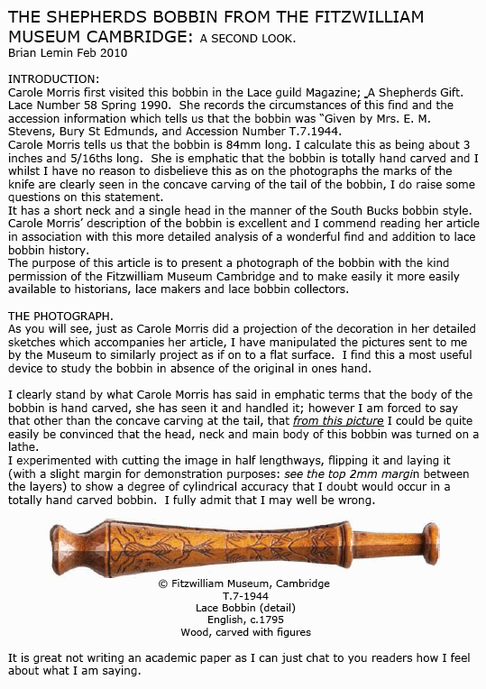 Lemin, Brian. The Shepherd's Bobbin from the Fitzwilliam Museum Cambridge - a second look, 8 pages. Posted February 8, 2011. FIRST PAGE. File size 256KB PDF