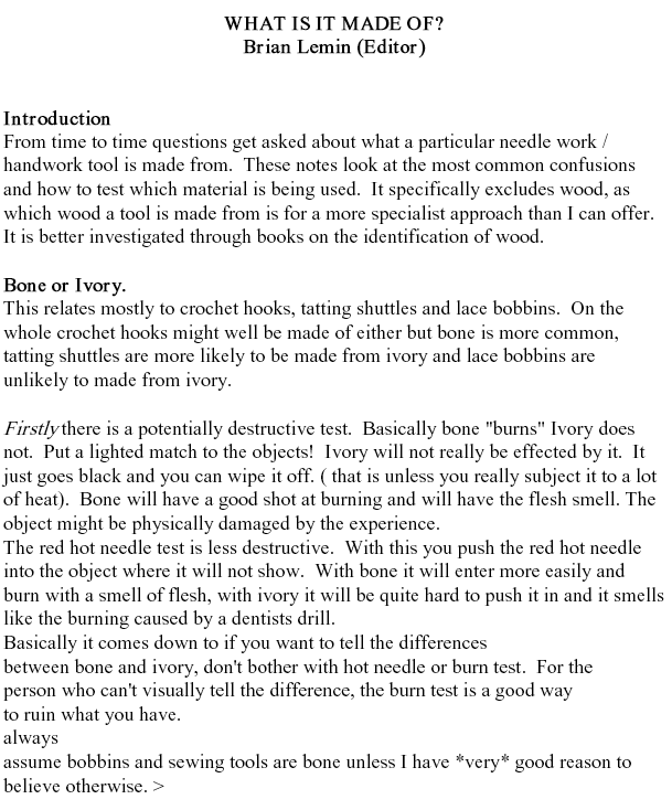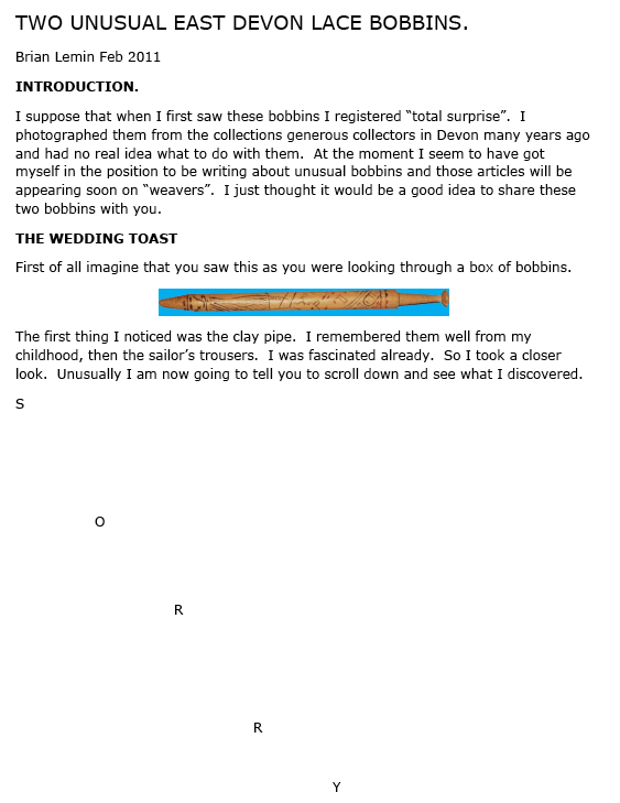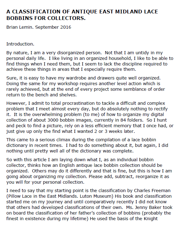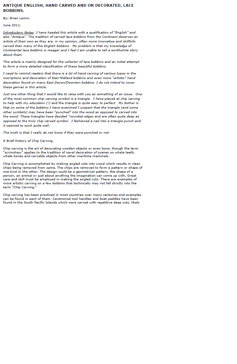 Lemin, Brian. Antique English, Hand Carved and or Decorated, Lace Bobbins 11 pages. Posted July 13, 2011. FIRST PAGE. File size 1.04MB PDF